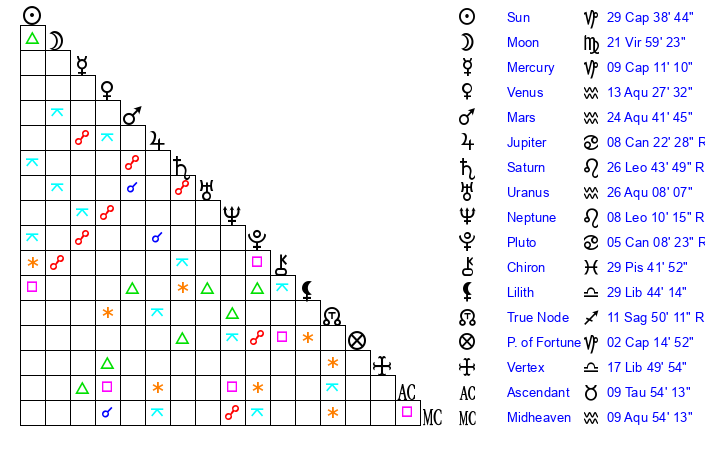 | Sun | 29 Capricorn 39 | 0 Aquarius 56 | 15 Taurus 8 |