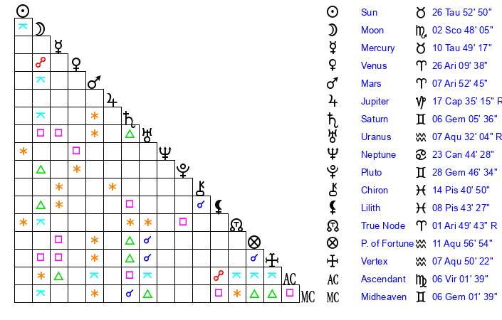 | Sun | 26 Taurus 53 | 27 Taurus 46 | 14 Virgo 12 |