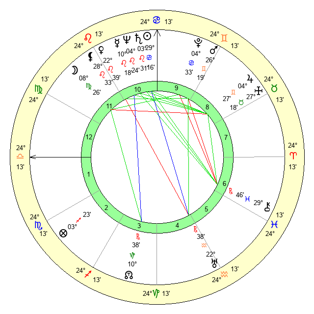 | Moon | 8 Virgo 27 | 2 Cancer 37 | 25 Leo 36 |