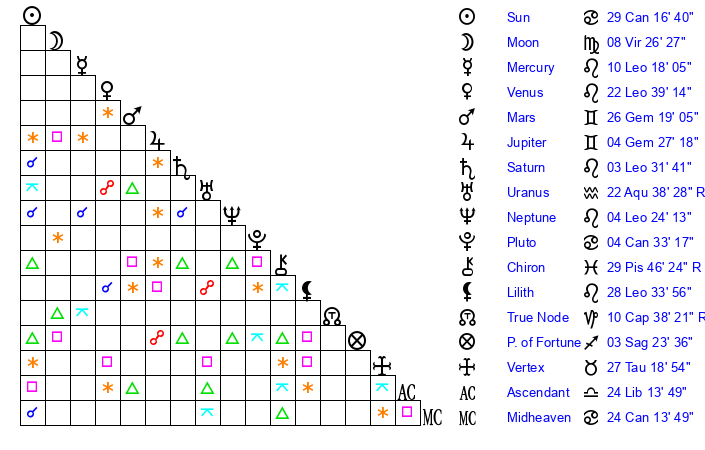 | Moon | 8 Virgo 27 | 2 Cancer 37 | 25 Leo 36 |