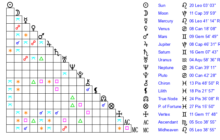 | Mercury | 6 Leo 41 | 4 Leo 30 | 22 Scorpio 42 |