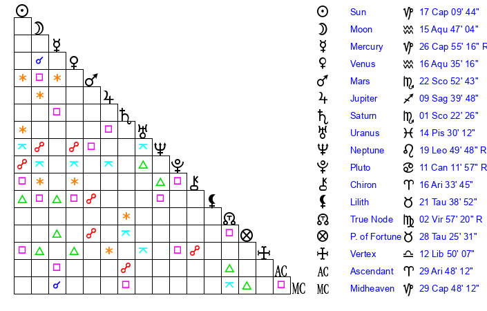 | Venus | 16 Aquarius 35 | 5 Pisces 49 | 13 Gemini 55 |