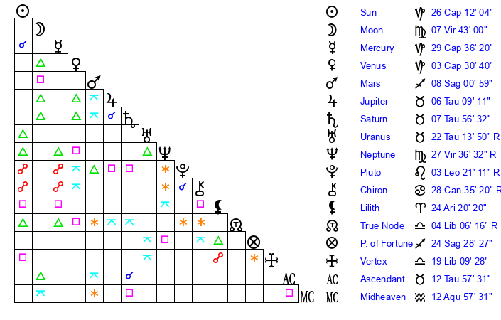 | Neptune | 27 Virgo 37 | 27 Pisces 34 | 25 Virgo 41 |