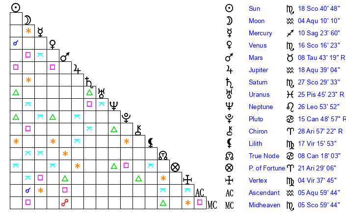 | Sun | 18 Scorpio 41 | 19 Scorpio 41 | 29 Aquarius 11 |
