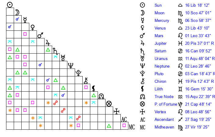 | Venus | 23 Libra 43 | 26 Virgo 3 | 10 Pisces 37 |