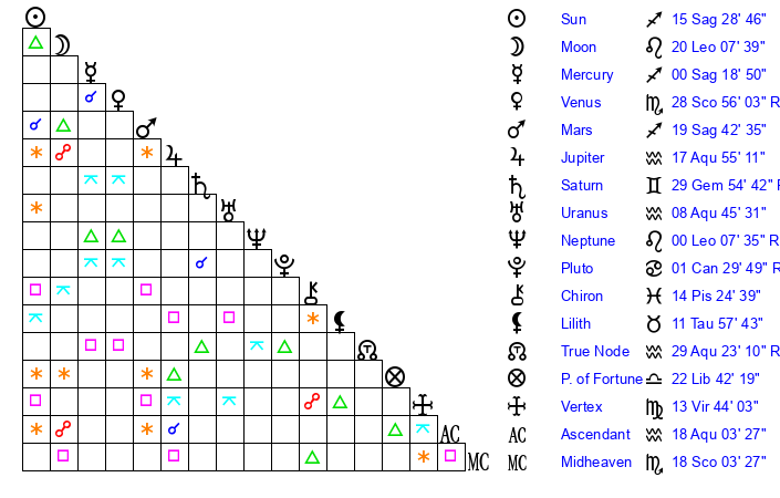 | Moon | 20 Leo 6 | 13 Pisces 53 | 29 Leo 18 |