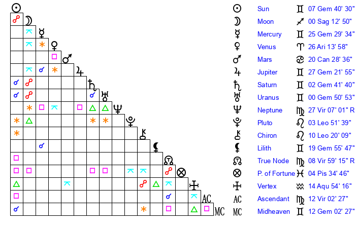 | Sun | 7 Gemini 41 | 8 Gemini 34 | 27 Leo 1 |