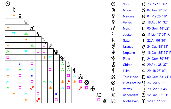 | Sun | 23 Pisces 15 | 24 Pisces 22 | 14 Cancer 40 |