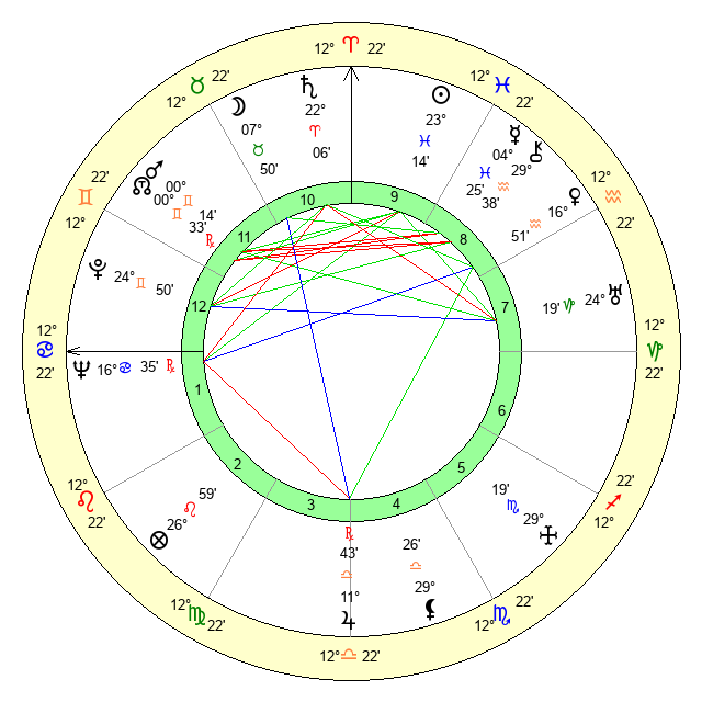 | Moon | 7 Taurus 45 | 28 Virgo 52 | 25 Cancer 30 |