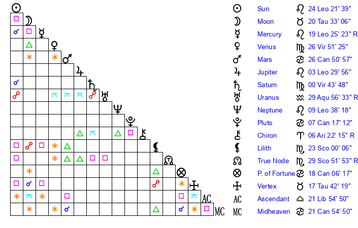| Mercury | 19 Leo 25 | 7 Leo 11 | 10 Sagittarius 33 |