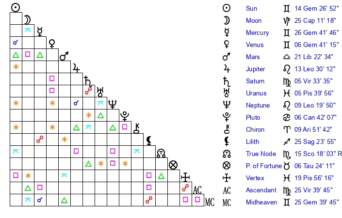 | Sun | 14 Gemini 27 | 15 Gemini 2 | 25 Virgo 12 |