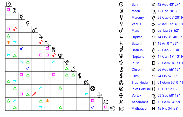 | Sun | 12 Aquarius 44 | 13 Aquarius 50 | 6 Gemini 12 |