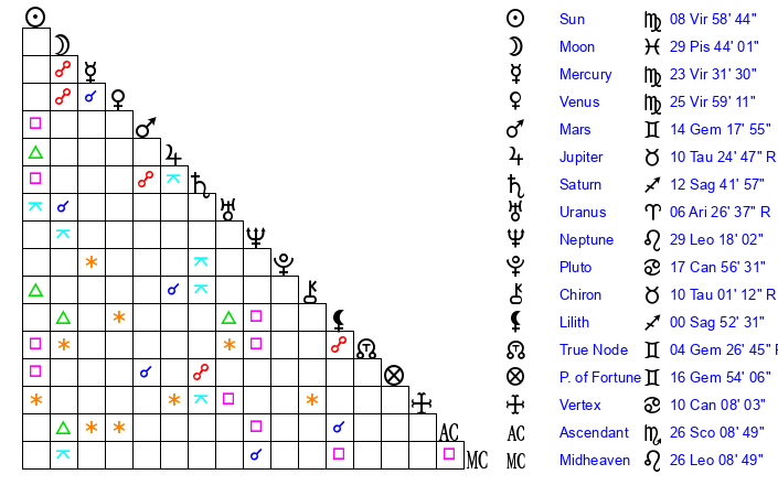 | Venus | 26 Virgo 0 | 8 Leo 24 | 24 Capricorn 47 |
