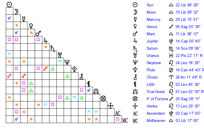 | Moon | 10 Libra 12 | 29 Leo 20 | 18 Gemini 5 |