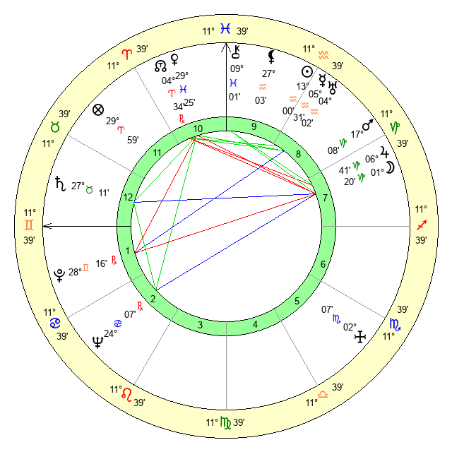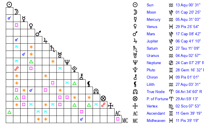 Sun | 13 Aquarius 0 | 13 Aquarius 50 | 3 Gemini 36 |