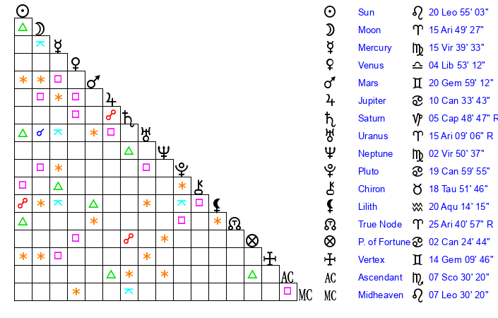Moon | 15 Aries 48 | 28 Aries 28 | 16 Libra 12 |