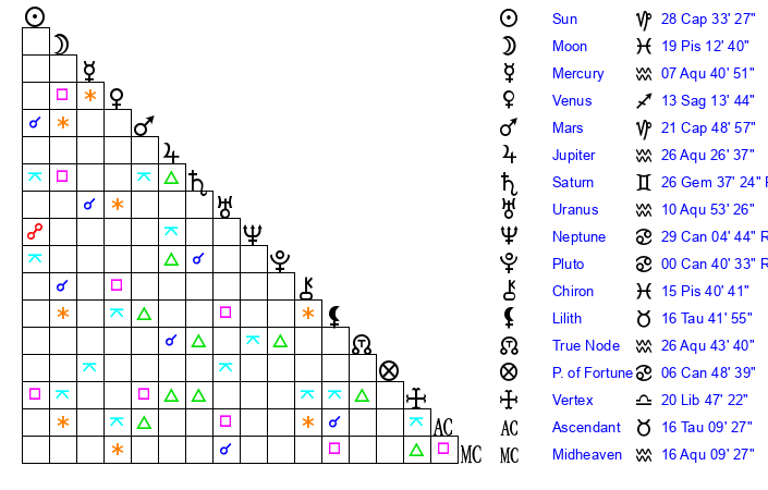 | Moon | 19 Pisces 12 | 6 Libra 37 | 28 Pisces 47 |