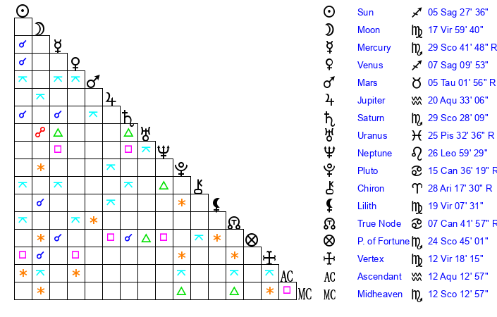 | Moon | 17 Virgo 59 | 5 Scorpio 18 | 22 Aries 24 |