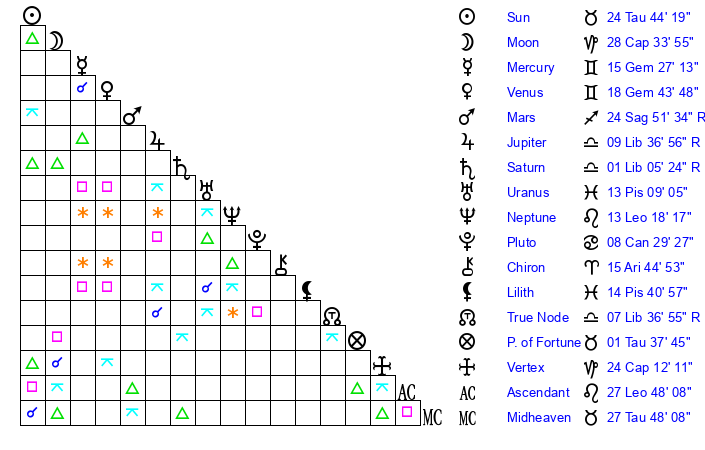 | Sun | 24 Taurus 44 | 25 Taurus 48 | 3 Virgo 20 |