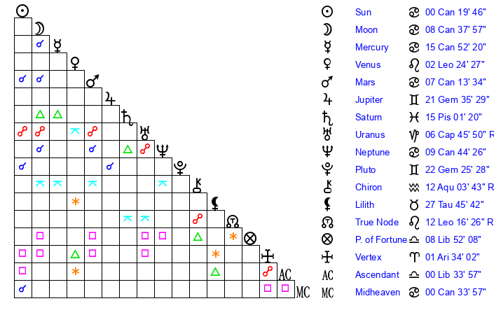 | Neptune | 9 Cancer 45 | 2 Aries 7 | 12 Cancer 39 |