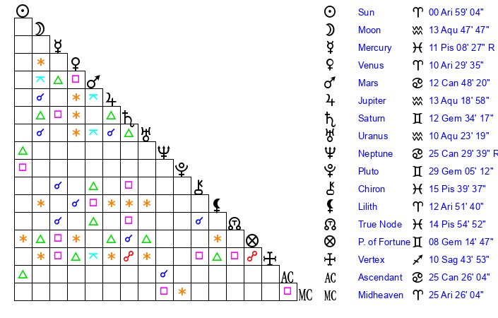 | Sun | 0 Aries 59 | 2 Aries 4 | 18 Cancer 16 |