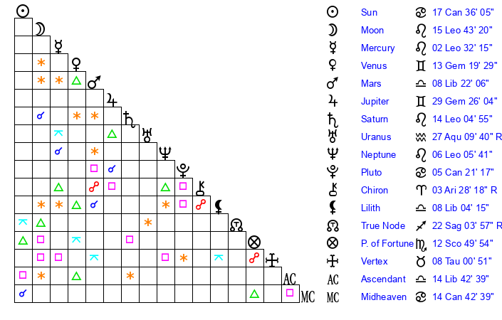 | Moon | 15 Leo 42 | 16 Capricorn 59 | 19 Cancer 13 |