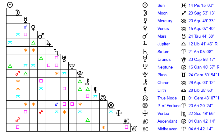 | Sun | 14 Pisces 15 | 15 Pisces 22 | 6 Cancer 5 |