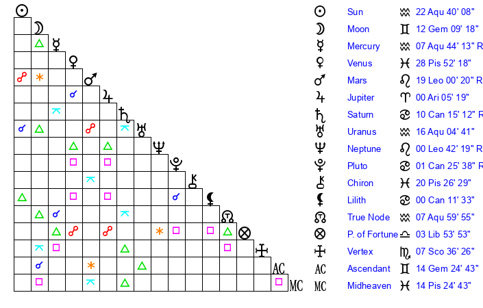 | Sun | 22 Aquarius 40 | 24 Aquarius 14 | 9 Gemini 52 |