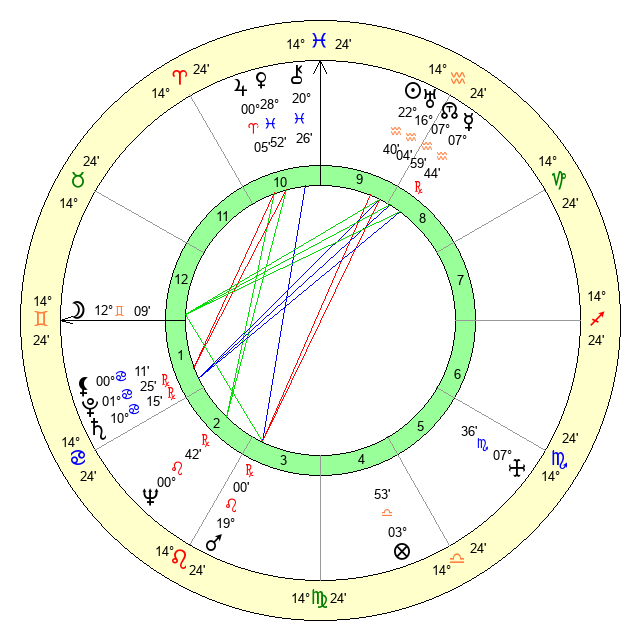 | Moon | 12 Gemini 10 | 25 Leo 38 | 8 Gemini 31 |