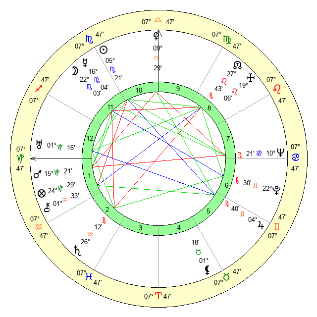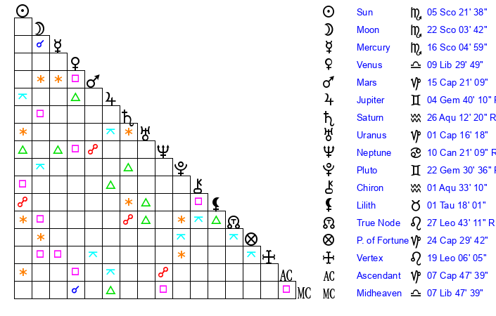 | Moon | 21 Scorpio 58 | 3 Aquarius 42 | 12 Aries 52 |