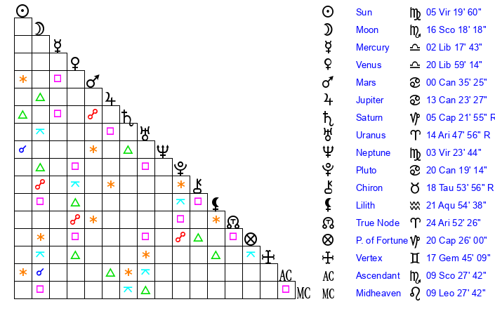 | Neptune | 3 Virgo 24 | 1 Aries 24 | 5 Virgo 47 |