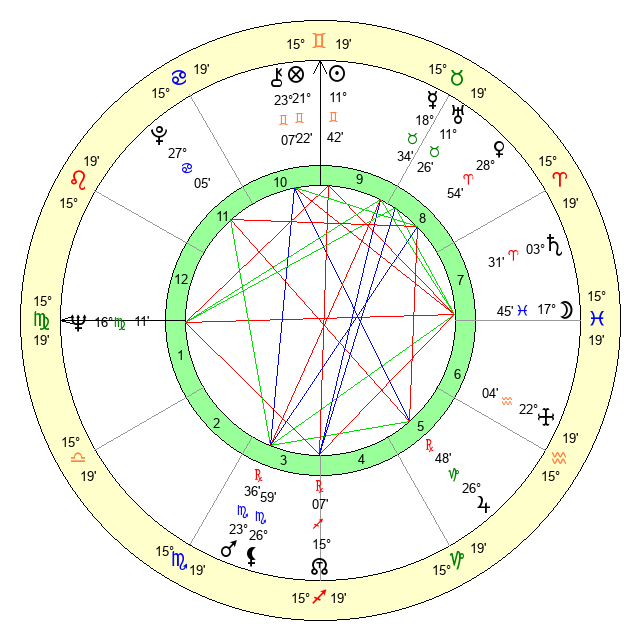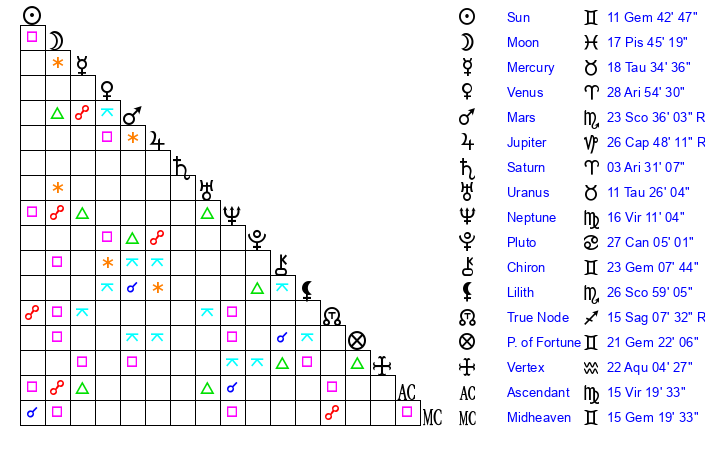 | Moon | 17 Pisces 36 | 7 Virgo 26 | 15 Gemini 9 |