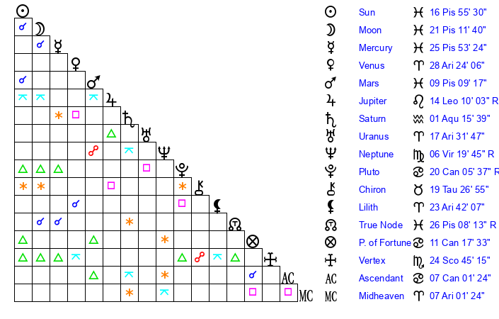 | Neptune | 6 Virgo 19 | 29 Pisces 8 | 5 Virgo 20 |