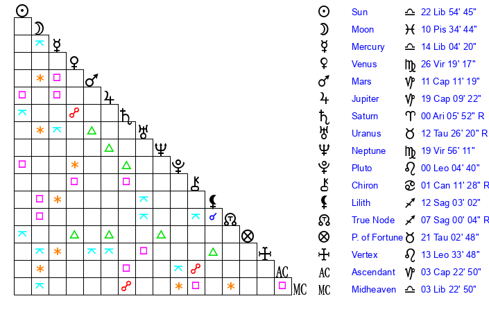 | Sun | 22 Libra 54 | 23 Libra 35 | 21 Capricorn 51 |