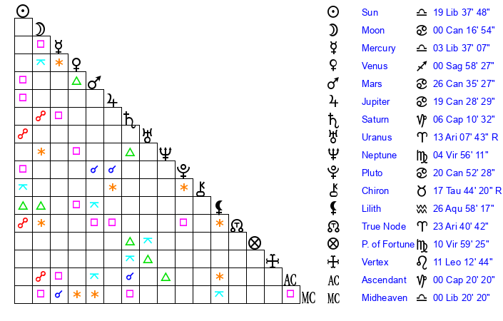 | Sun | 19 Libra 38 | 20 Libra 36 | 25 Capricorn 37 |
