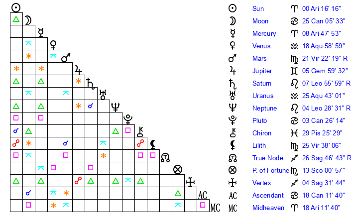 | Sun | 0 Aries 16 | 1 Aries 20 | 13 Cancer 47 |