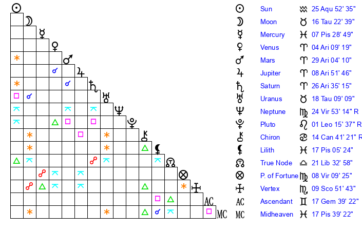 | Sun | 25 Aquarius 52 | 27 Aquarius 16 | 19 Taurus 52 |