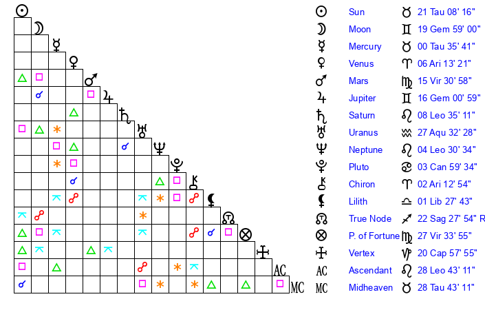 | Moon | 19 Gemini 58 | 22 Scorpio 14 | 19 Taurus 13 |