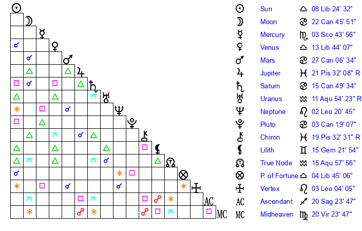 | Venus | 13 Libra 44 | 16 Virgo 10 | 0 Pisces 47 |