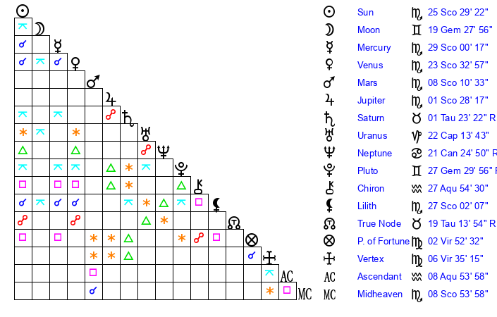 Sun | 25 Scorpio 29 | 26 Scorpio 51 | 21 Pisces 1 |