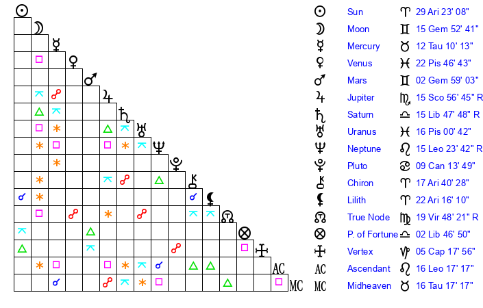| Sun | 29 Aries 23 | 0 Taurus 39 | 7 Leo 15 |