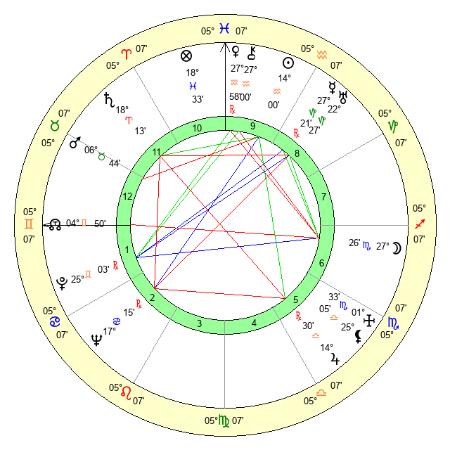 | Moon | 27 Scorpio 21 | 23 Aries 41 | 9 Aquarius 50 |
