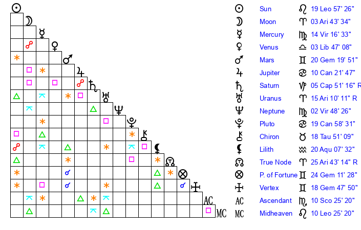 | Neptune | 2 Virgo 49 | 1 Aries 46 | 5 Virgo 39 |