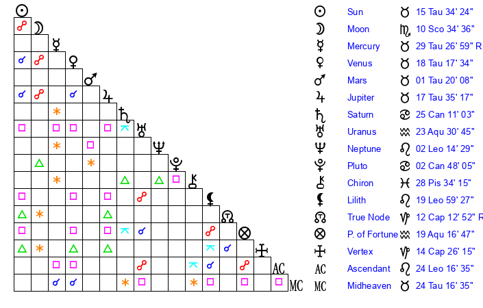 | Sun | 15 Taurus 34 | 16 Taurus 25 | 29 Leo 0 |