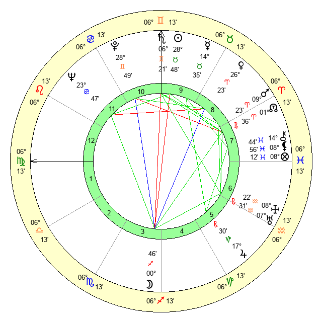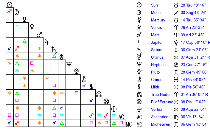 | Saturn | 6 Gemini 57 | 29 Pisces 32 | 18 Gemini 25 |