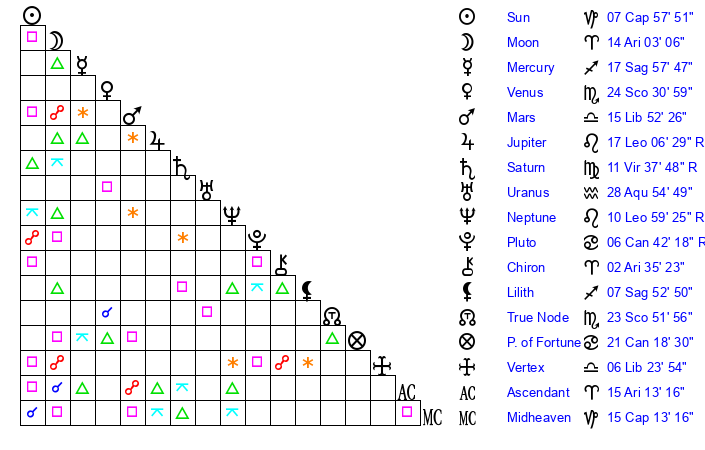 | Moon | 14 Aries 9 | 6 Capricorn 43 | 17 Aquarius 35 |