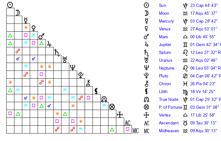| Moon | 17 Aquarius 38 | 4 Leo 16 | 12 Capricorn 40 |