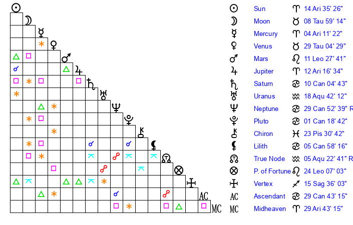| Neptune | 29 Cancer 53 | 0 Aries 11 | 2 Leo 17 |
