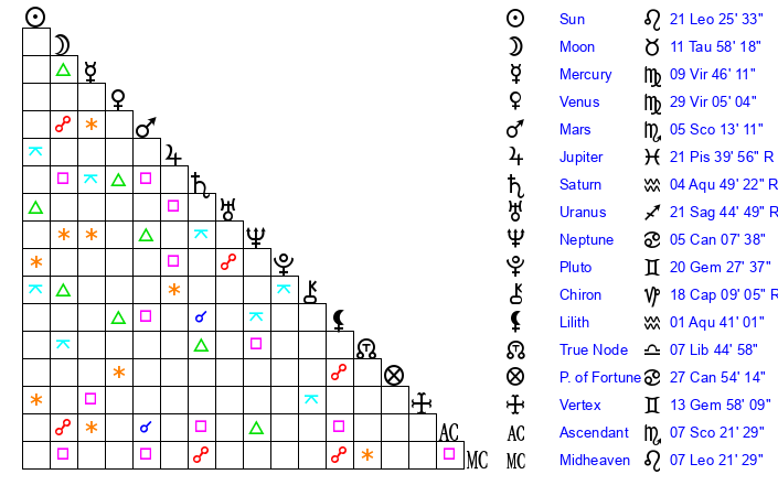 | Moon | 11 Taurus 50 | 12 Taurus 42 | 11 Scorpio 59 |