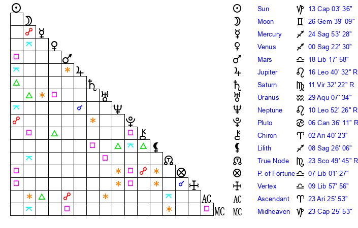 | Moon | 26 Gemini 51 | 14 Pisces 47 | 25 Aries 41 |